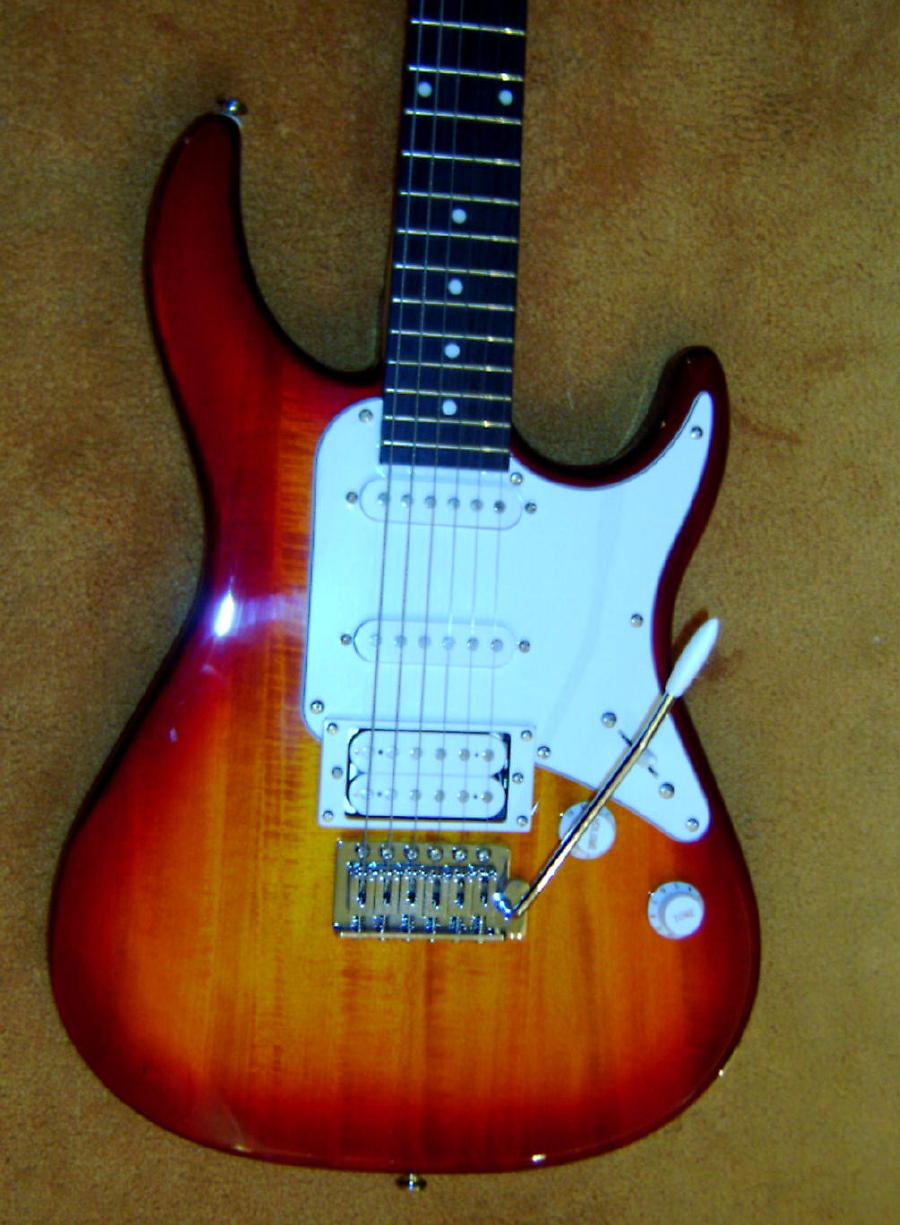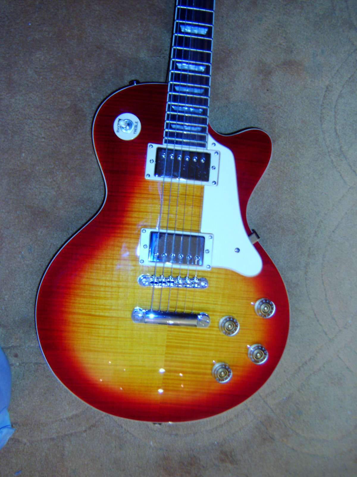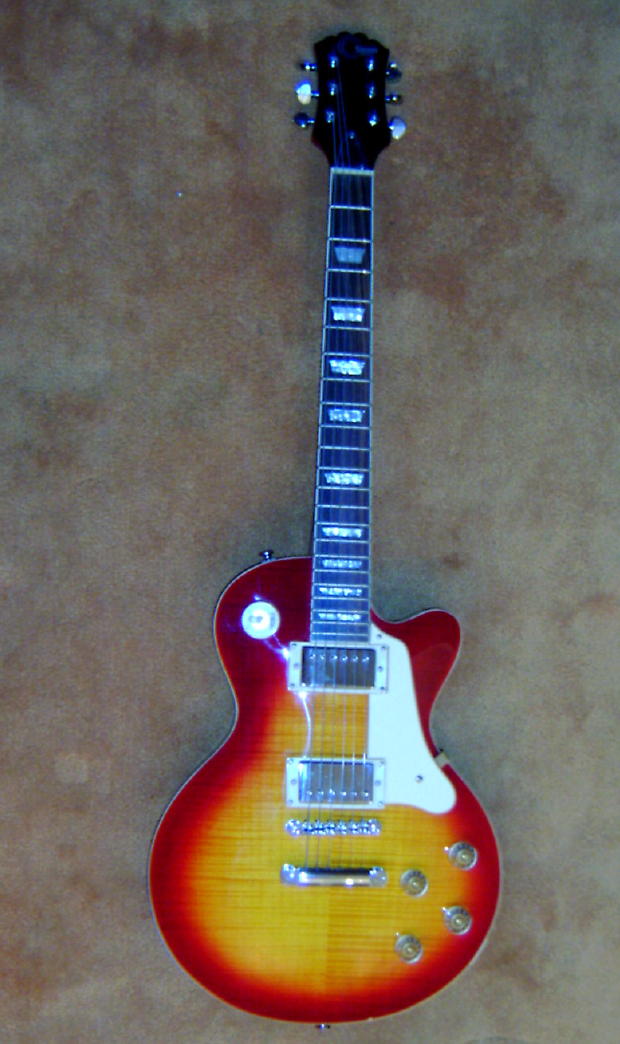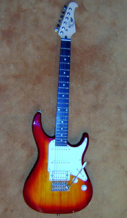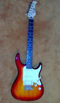 SLP04 Gem (£189.00) This is a quality Les Paul Style guitar with Mahogany (Nato) body, carved Flame Maple top, Mahogany set Neck with rosewood fretboard, 2 high output alnico humbucker pickups, quality chrome furniture and cream binding to body and neck. For Full Spec Click Here. |