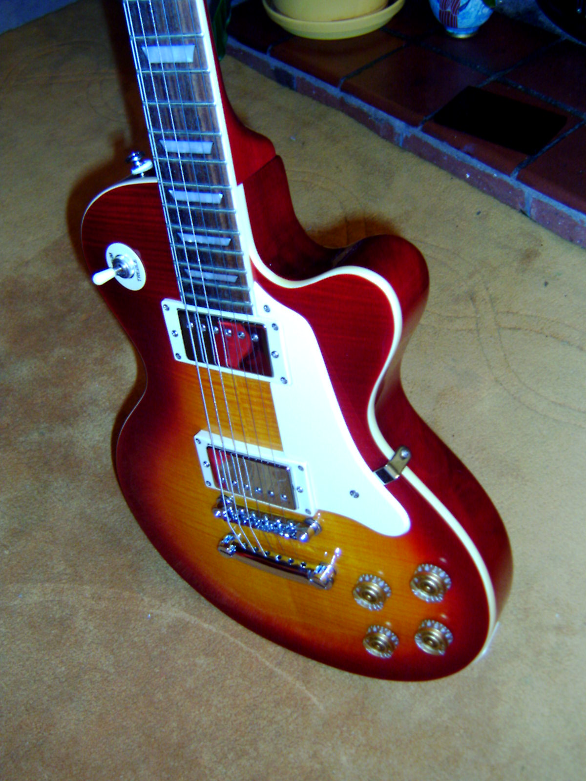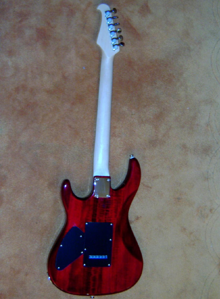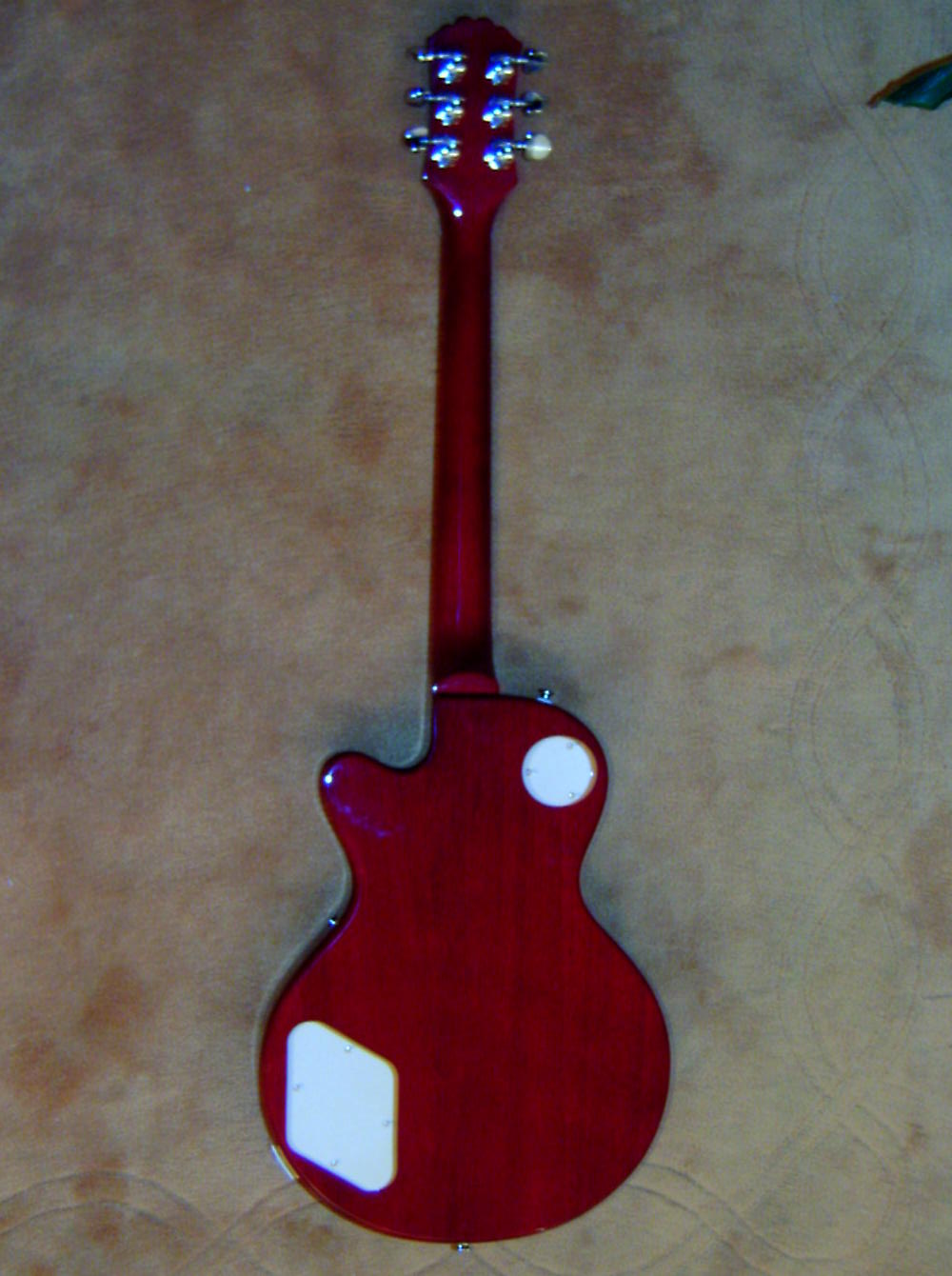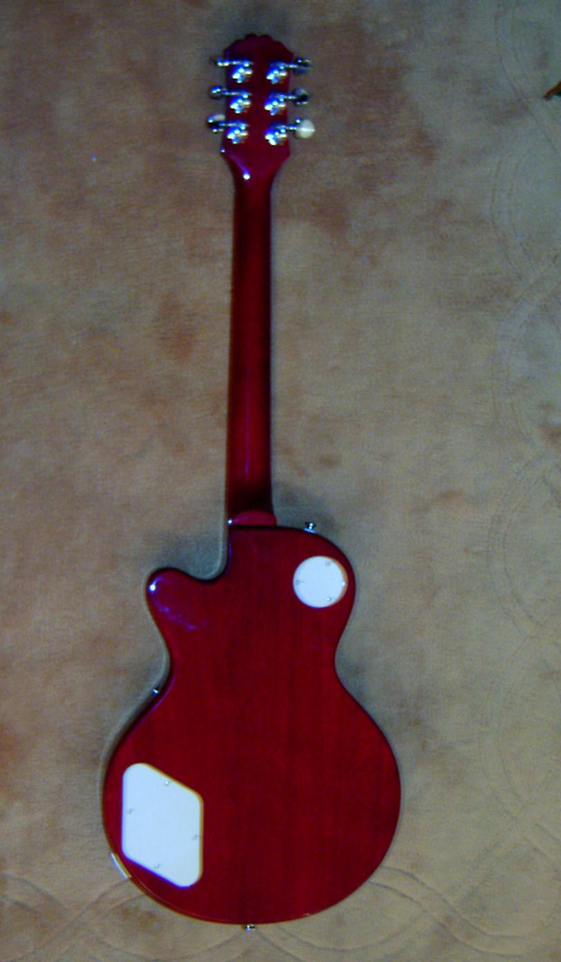 SLP04 Gem (£189.00) This is a quality Les Paul Style guitar with Mahogany (Nato) body, carved Flame Maple top, Mahogany set Neck with rosewood fretboard, 2 high output alnico humbucker pickups, quality chrome furniture and cream binding to body and neck. For Full Spec Click Here. |